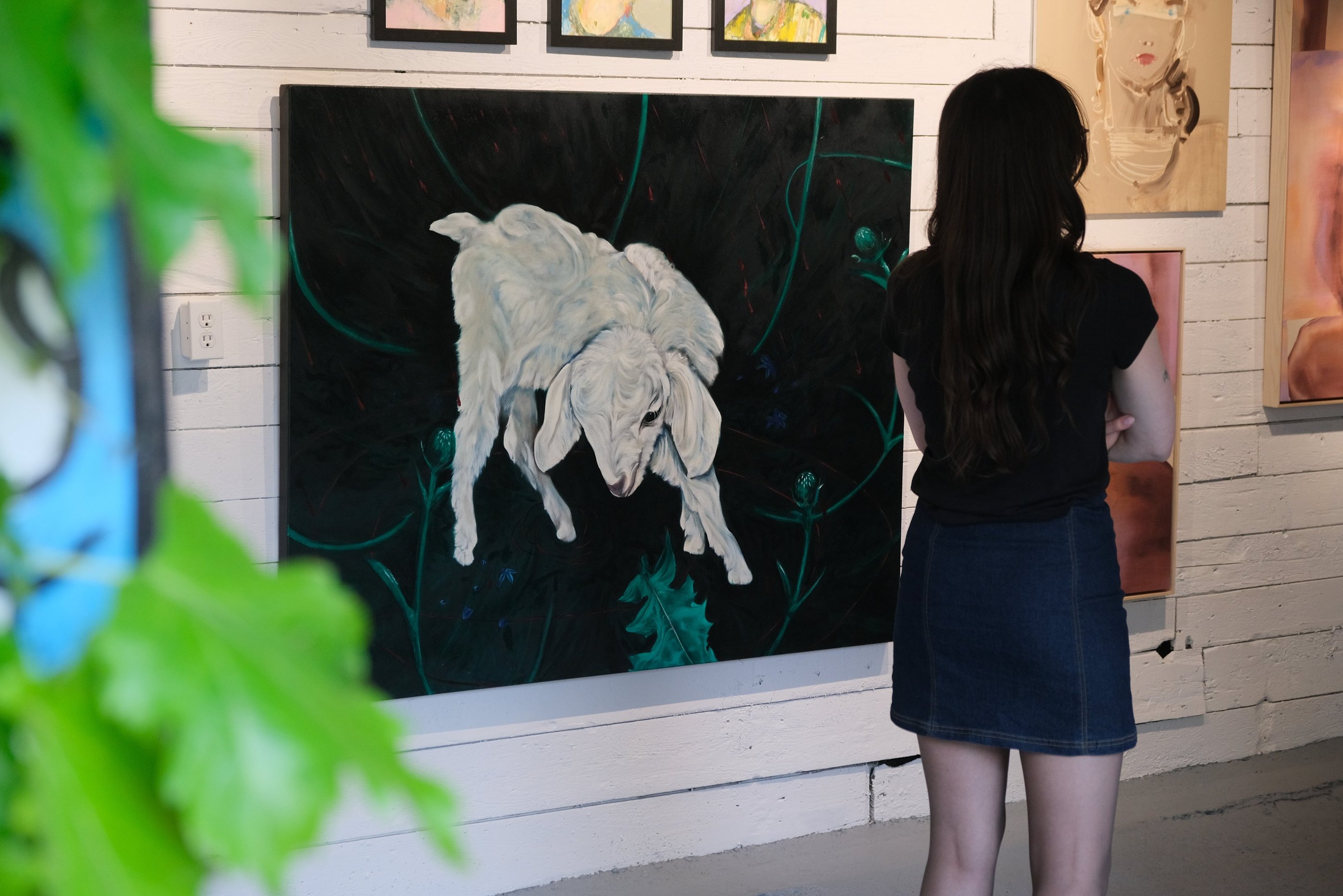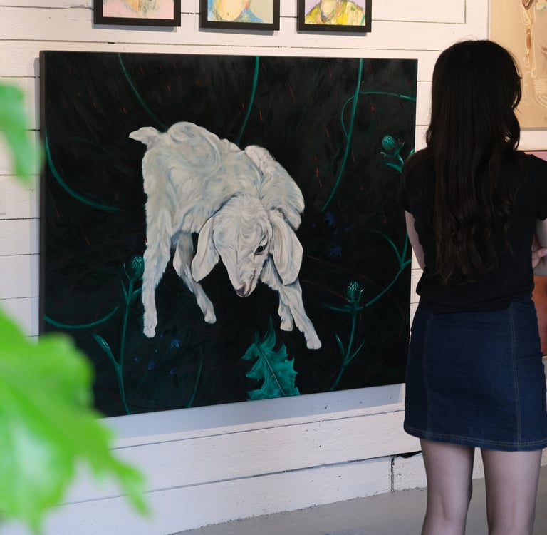 Holbrough’s work centers on nocturnal environments: spaces where hidden narratives surface and occupy space. These transient worlds arise from memory, sensation, and narrative structure. Themes of class, femininity, and religious influence run through the work, emerging in gestures and suggestive forms that blur the line between the material and the unseen. Her figures often appear caught in processes of becoming and dissolving, suspended within a shifting, in-between space. Highly rendered elements, contrast the fluid gestural forms. These shadowed settings function as a stage for the periphery, inviting viewers to embrace ambiguity. The work asks for patience, a slow looking, and a willingness to linger in the unseen.